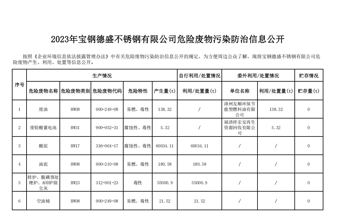 2023年寶鋼德盛不銹鋼有限公司危險廢物污染防治信息公開